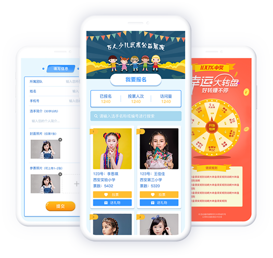 注册登录、身份认证、投票选择、投票结果、自主报名、数据展示、活动时间、活动详情、留言回复、问卷调查、新闻资讯等……
